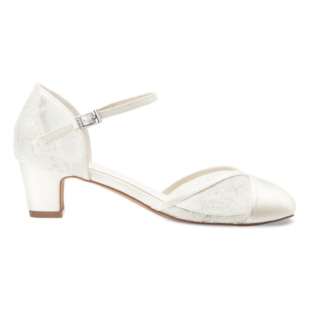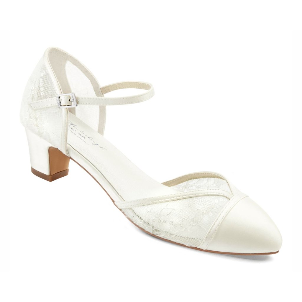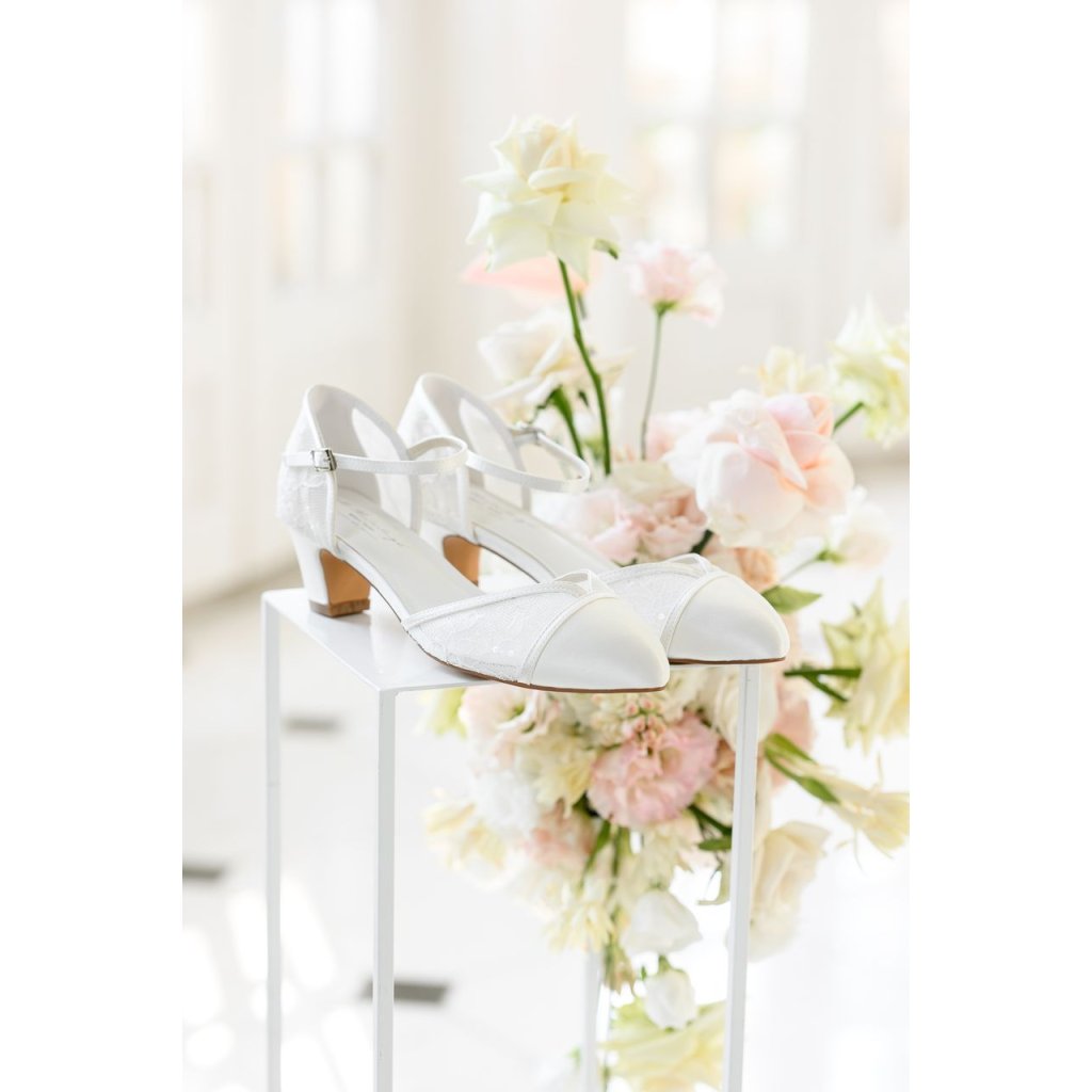 Nízke svadobné lodičky Hailey s povrchom z transparentnej čipky s kvetinovým motívom a saténu, z kolekcie prémiovej značky G. Westerleigh. Stabilné blokové podpätky vysoké 5cm. Špeciálna penová výplň v podrážke a jemná kožená stielka pre dokonalé pohodlie vo svadobný deň. Posledný pár vo veľ. 40 a slonovinovej farbe (ivory).